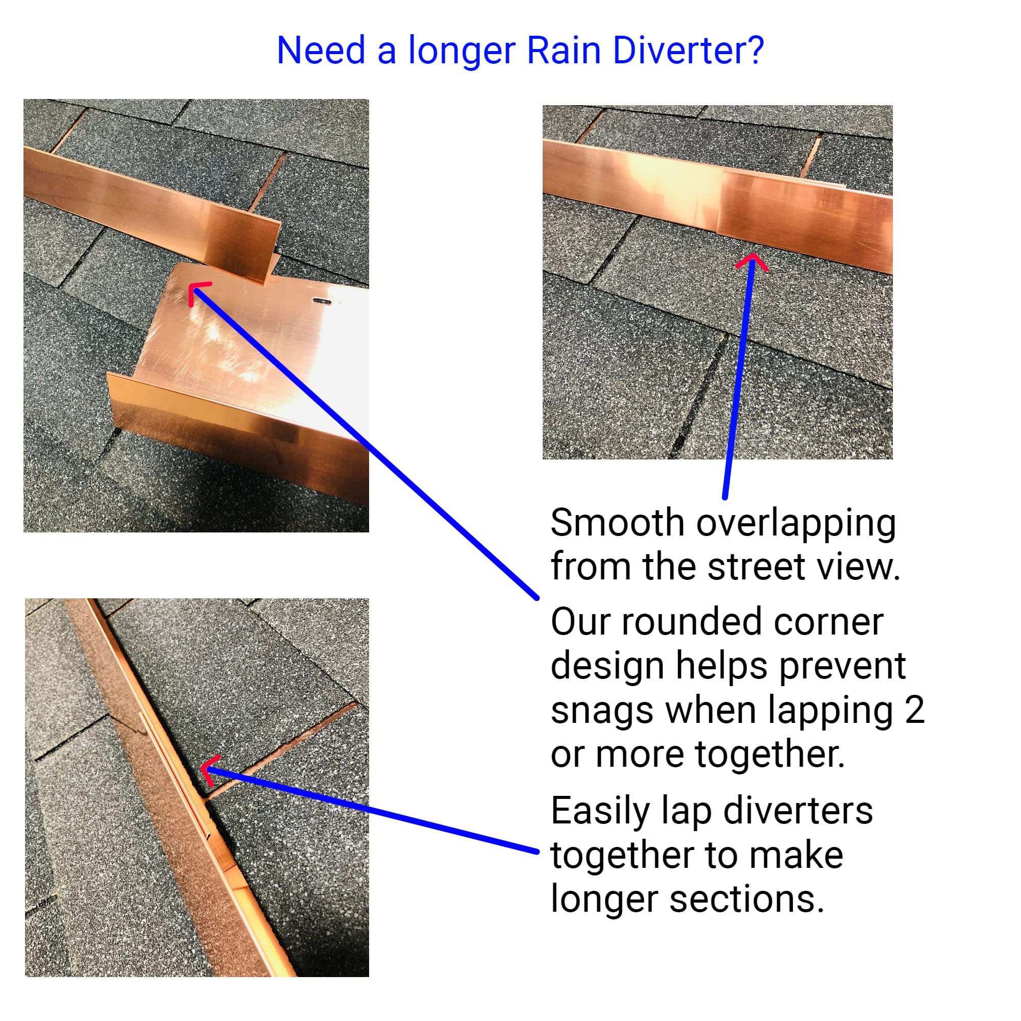 - {Easy to Install} - Simply slide under shingle tabs and fasten with included nails. - Each order includes installation instructions and hardware. - Rounded corners and slotted nail holes make for simple installation. - Can be easily overlapped with other diverters to make longer sections.